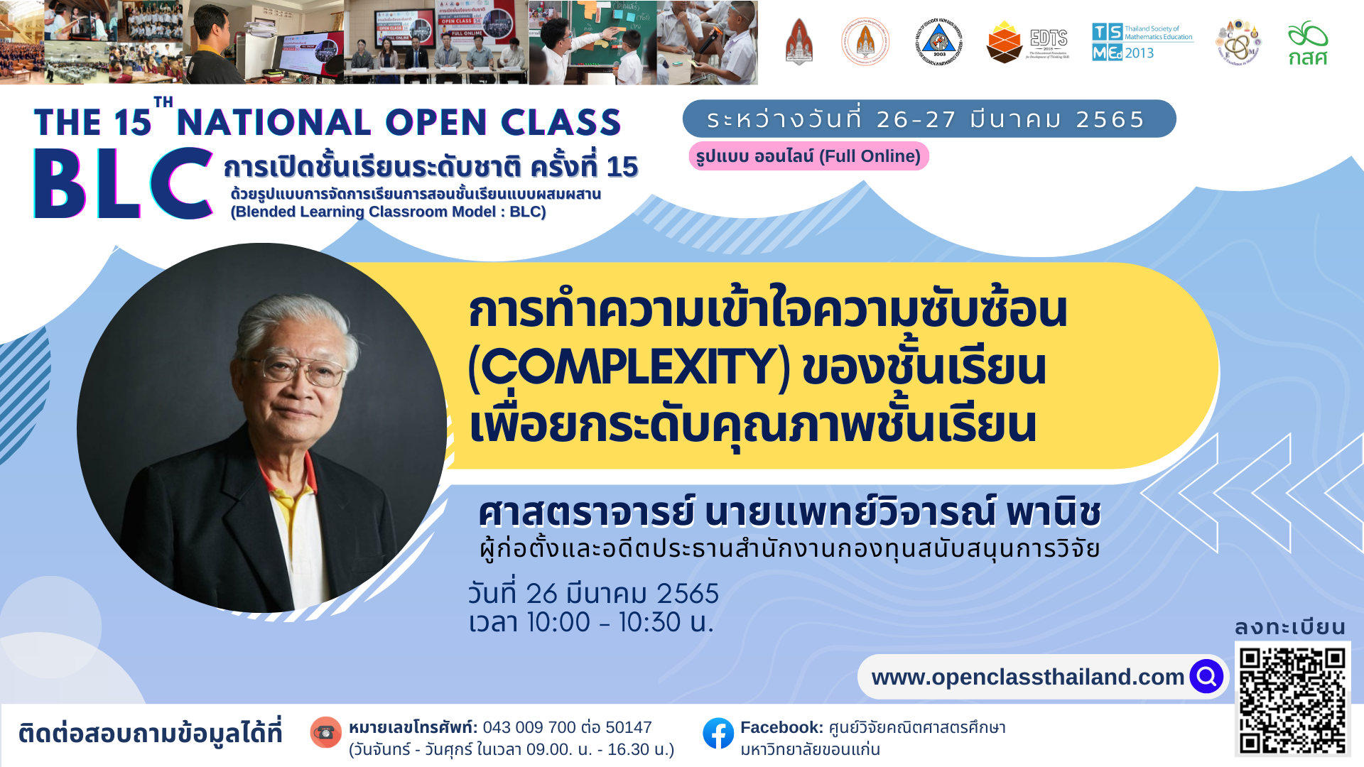 การเปิดชั้นเรียนระดับชาติ ครั้งที่ 15 (The 15th National Open Class) จัดขึ้นระหว่างวันที่ 26 - 27 มีนาคม พ.ศ. 2565 ในรูปแบบออนไลน์ (Full Online) เป็นความร่วมมือระหว่างมหาวิทยาลัยขอนแก่น โดย ฝ่ายการศึกษาและบริการวิชาการ สถาบันวิจัยและพัฒนาวิชาชีพครูสำหรับอาเซียน และศูนย์วิจัยคณิตศาสตรศึกษา ร่วมกับ มูลนิธิการศึกษาเพื่อการพัฒนาทักษะการคิด สมาคมคณิตศาสตรศึกษา ศูนย์ความเป็นเลิศด้านคณิตศาสตร์ และกองทุนเพื่อความเสมอภาคทางการศึกษา (กสศ.) โดยกิจกรรมภายในงานครั้งนี้ ประกอบด้วย
