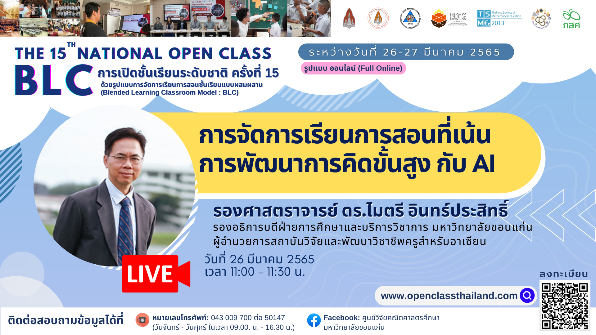 การจัดกิจกรรมเปิดชั้นเรียนระดับชาติ ครั้งที่ 15 ในวันนี้ นับว่าเป็นกิจกรรมที่สำคัญระดับชาติ ที่จะส่งเสริมให้เห็นอีกว่า มหาวิทยาลัยขอนแก่น ในฐานะสถาบันอุดรมศึกษา เห็นความสำคัญอย่างยิ่งที่จะร่วมขับเคลื่อนตามนโยบาย กระทรวงการอุดมศึกษา วิทยาศาสตร์ วิจัยและนวัตกรรม (สปอว.) เกี่ยวกับแผนด้านการอุดมศึกษาเพื่อผลิตและพัฒนากำลังคนของประเทศ ในการพัฒนาครูของประเทศอย่างเป็นรูปธรรม ด้วยการเชื่อมโยงกับ Reskill Upskill Newskill สู่ Lifelong Learning เพื่อดำเนินการพัฒนาครูได้อย่างยั่งยืนและตรงตามความต้องการของตลาดแรงงาน ซึ่งในโอกาสการเข้าร่วมกิจกรรมในครั้งนี้ จะเปิดโอกาสให้ทุกท่านได้ร่วมเรียนรู้และมีความเข้าใจเบื้องต้นเกี่ยวกับนวัตกรรม การศึกษาชั้นเรียน (Lesson Study) และวิธีการแบบเปิด (Open Approach) ซึ่งเป็นนวัตกรรมที่ใช้มากกว่า 100 ปี ในประเทศญี่ปุ่น ได้ร่วมสังเกตชั้นเรียนที่ใช้นวัตกรรม ได้เห็นว่าชั้นเรียนที่เน้นให้นักเรียนเกิดทักษะในศตวรรษที่ 21 เป็นอย่างไร และเพื่อให้ได้ชั้นเรียนแบบนั้น ผู้บริหารโรงเรียน และคุณครูต้องทำอย่างไร ต้องวางแผนในการดำเนินงานอย่างไร ได้เห็นมุมมองในเรื่องของ Best Practice ในด้านต่างๆ โดยผู้อำนวยการโรงเรียนที่มากประสบการณ์ รวมทั้งในส่วนของสารคดีเกี่ยวกับการจัดการเรียนการสอนแบบผสมผสาน (BLC) ซี่งเป็นอีกหนึ่งแนวทางในการจัดการเรียนการสอนที่สำคัญในสถานการณ์ปัจจุบัน หวังเป็นอย่างยิ่งว่า จากองค์ความรู้ที่ทุกท่านจะได้ร่วมเรียนรู้ในวันนี้ จะมีประโยชน์ในการเพิ่มทักษะใหม่ (Upskill) เสริมทักษะที่จำเป็น (Reskill) และสร้างองค์ความรู้ใหม่ (New skill)