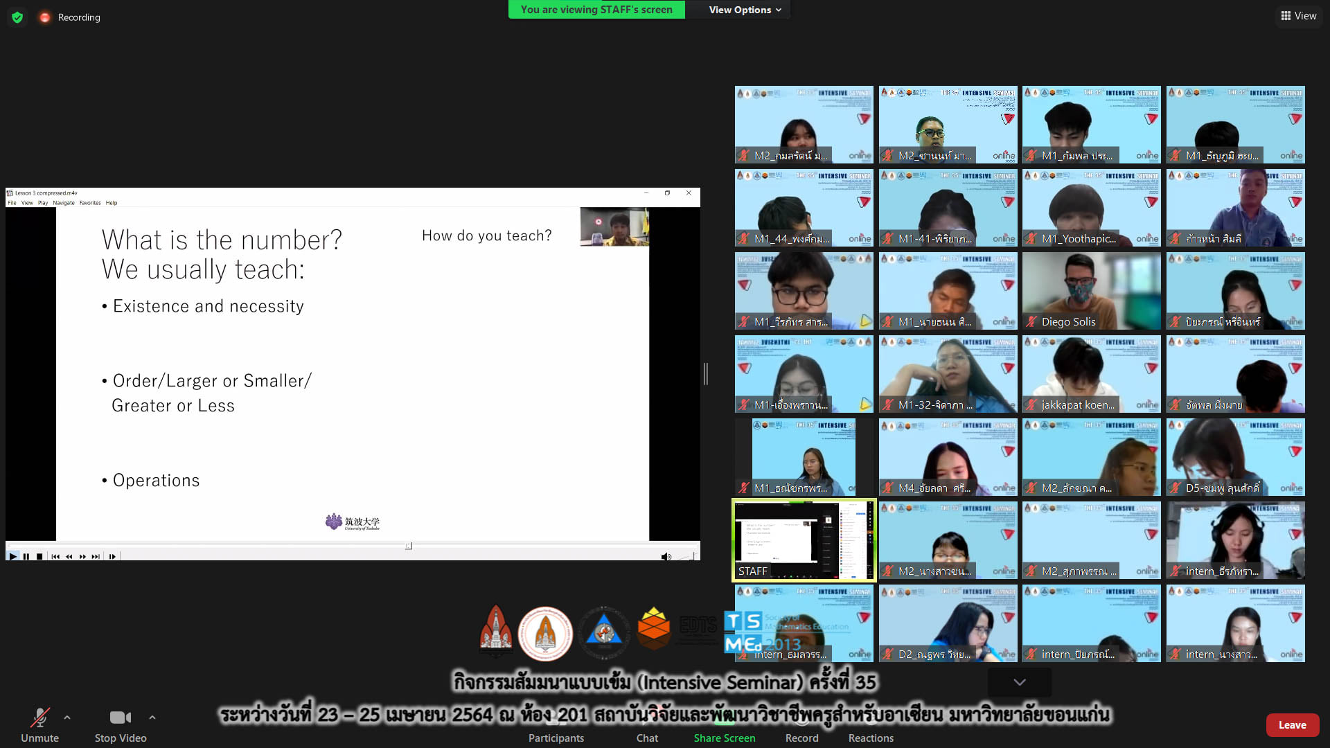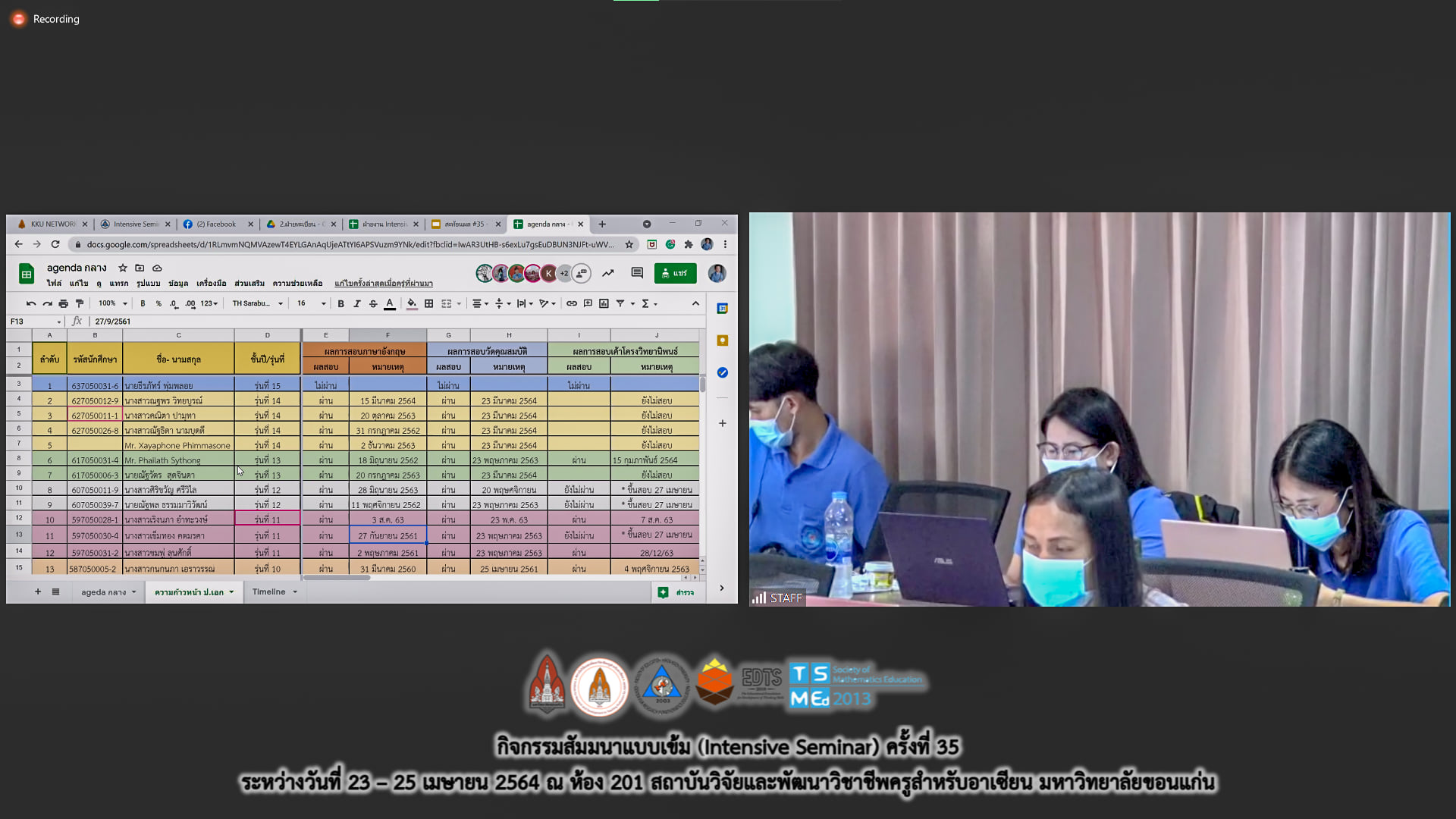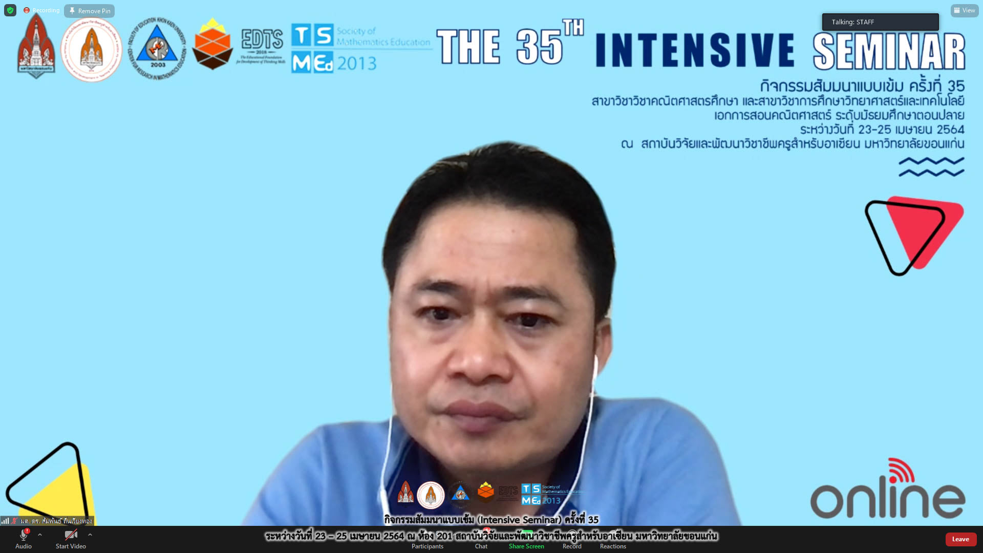ศูนย์วิจัยคณิตศาสตรศึกษาร่วมกับสาขาวิชาคณิตศาสตรศึกษาจัดกิจกรรม Intensive Seminar in Mathematics Education ครั้งที่ 35 ในรูปแบบออนไลน์ ระหว่างวันที่ 23 - 25 เมษายน พ.ศ. 2564 ณ สถาบันวิจัยและพัฒนาวิชาชีพครูสำหรับอาเซียน (Online และ On-site) โดยมีวัตถุประสงค์ เพื่อพัฒนาการทำวิจัยควบคู่กับการฝึกทำงานและเรียนรู้ของนักศึกษาร่วมกับผู้อื่น โดยมีผู้เข้าร่วมประกอบด้วยคณาจารย์ นักศึกษาบัณฑิตศึกษา และศิษย์เก่าสาขาวิชาคณิตศาสตรศึกษา ทั้งหมดร่วมกิจกรรมกว่า 100 คน ซึ่งกิจกรรมในครั้งนี้ประกอบด้วย