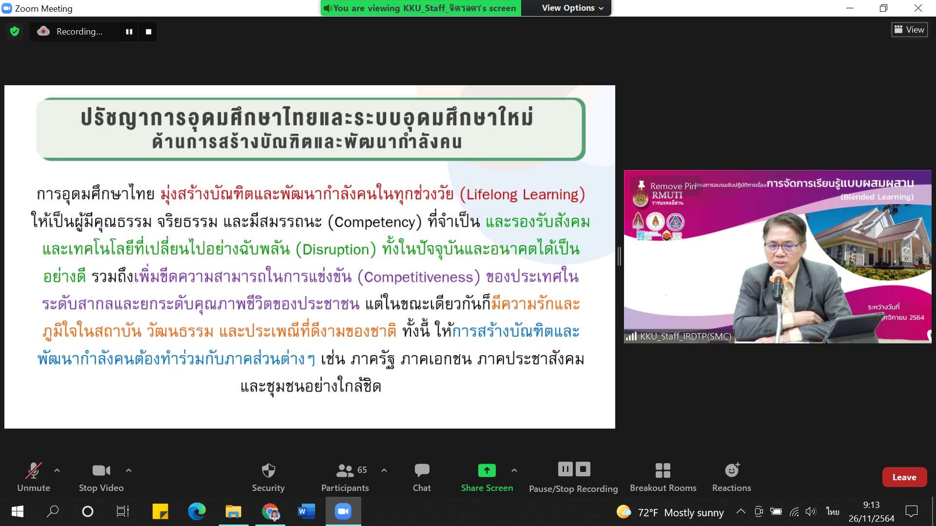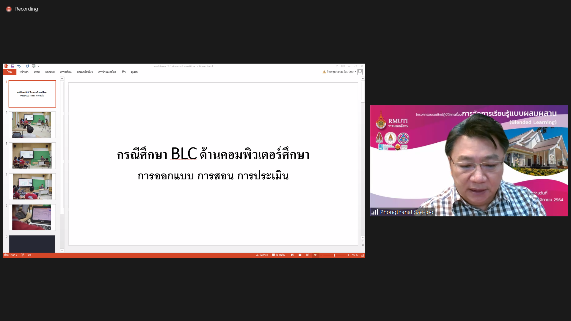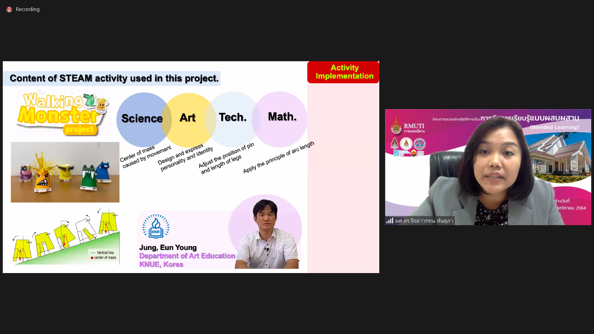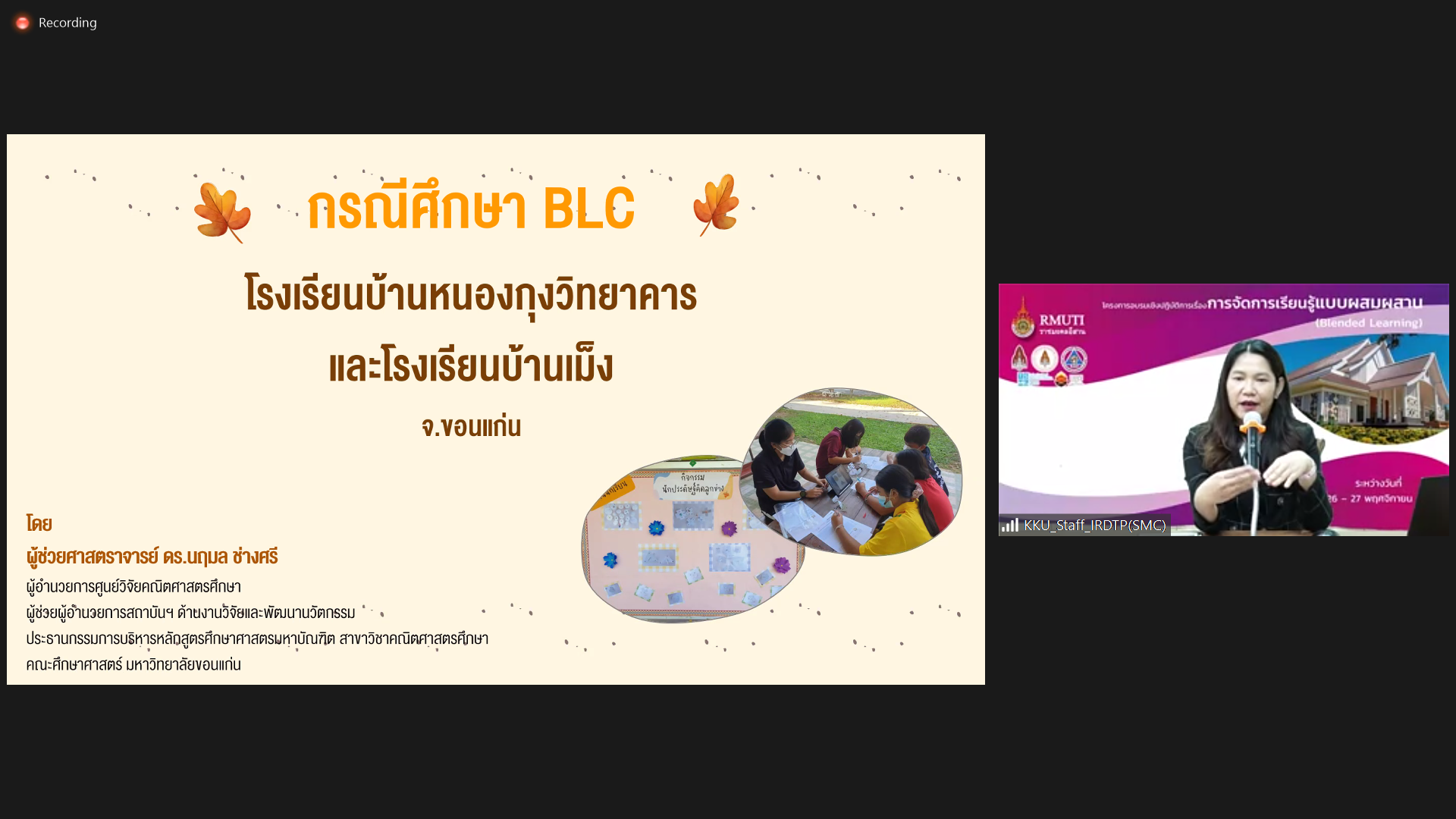 ในวันที่ 26 พฤศจิกายน 2564 รองศาสตราจารย์ ดร. ไมตรี อินทร์ประสิทธิ์ ได้บรรยายให้กรอบแนวคิดหลักการความหมายและความสำคัญของการจัดการเรียนรู้แบบผสมผสาน (BLC) หลังจากนั้นได้มีการแลกเปลี่ยนเกี่ยวกับกรณีศึกษาในการจัดการเรียนรู้แบบผสมผสานในหน่วยต่างๆ ดังนี้ 1) กรณีศึกษาการจัดการเรียนรู้แบบผสมผสานของโรงเรียนบ้านเม็ง และโรงเรียนหนองกุงวิทยาคาร หน่วยลูกข่าง โดย ผู้ช่วยศาสตราจารย์ ดร. นฤมล ช่างศรี ผู้อำนวยการศูนย์วิจัยคณิตศาสตรศึกษา และผู้ช่วยผู้อำนวยการสถาบันวิจัยและพัฒนาวิชาชีพครูสำหรับอาเซียน ด้านงานวิจัยและพัฒนานวัตกรรม 2) กรณีศึกษาการจัดการเรียนรู้แบบผสมผสาน หน่วย Walking Monster โดย ผู้ช่วยศาสตราจารย์ ดร.จิรดาวรรณ หันตุลา ผู้ช่วยผู้อำนวยการสถาบันวิจัยและพัฒนาวิชาชีพครูสำหรับอาเซียน ด้านงานพัฒนาวิชาชีพและบริการวิชาการ อาจารย์สาขาวิชาวิทยาศาตร์ศึกษา คณะศึกษาศาสตร์ มหาวิทยาลัยขอนแก่น 3) กรณีศึกษาการจัดการเรียนรู้แบบผสมผสาน หน่วยทางด้านคอมพิวเตอร์ศึกษา โดย ผู้ช่วยศาสตราจารย์ ดร.พงศ์ธนัช แซ่จู รักษาการแทนรองผู้อำนวยการสถาบันวิจัยและพัฒนาวิขาชีพครูสำหรับอาเซียน และอาจารย์สาขาคอมพิวเตอร์ศึกษาคณะศึกษาศาสตร์ มหาวิทยาลัยขอนแก่น