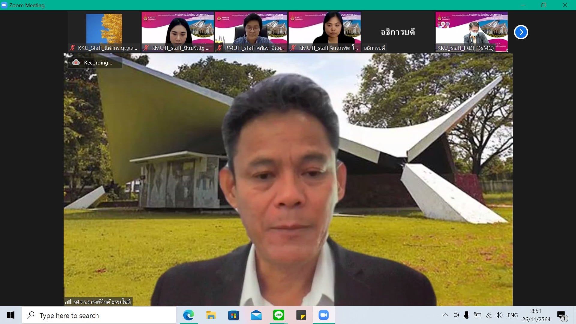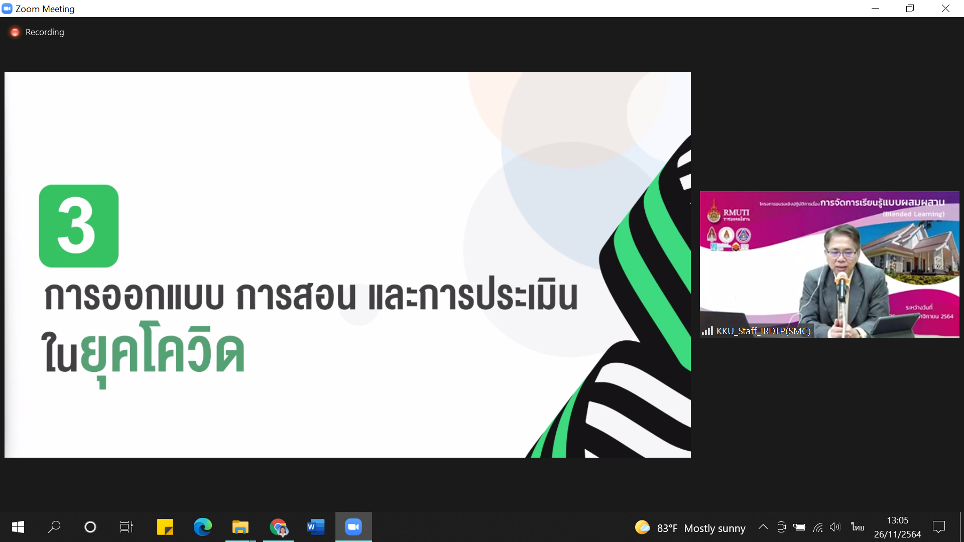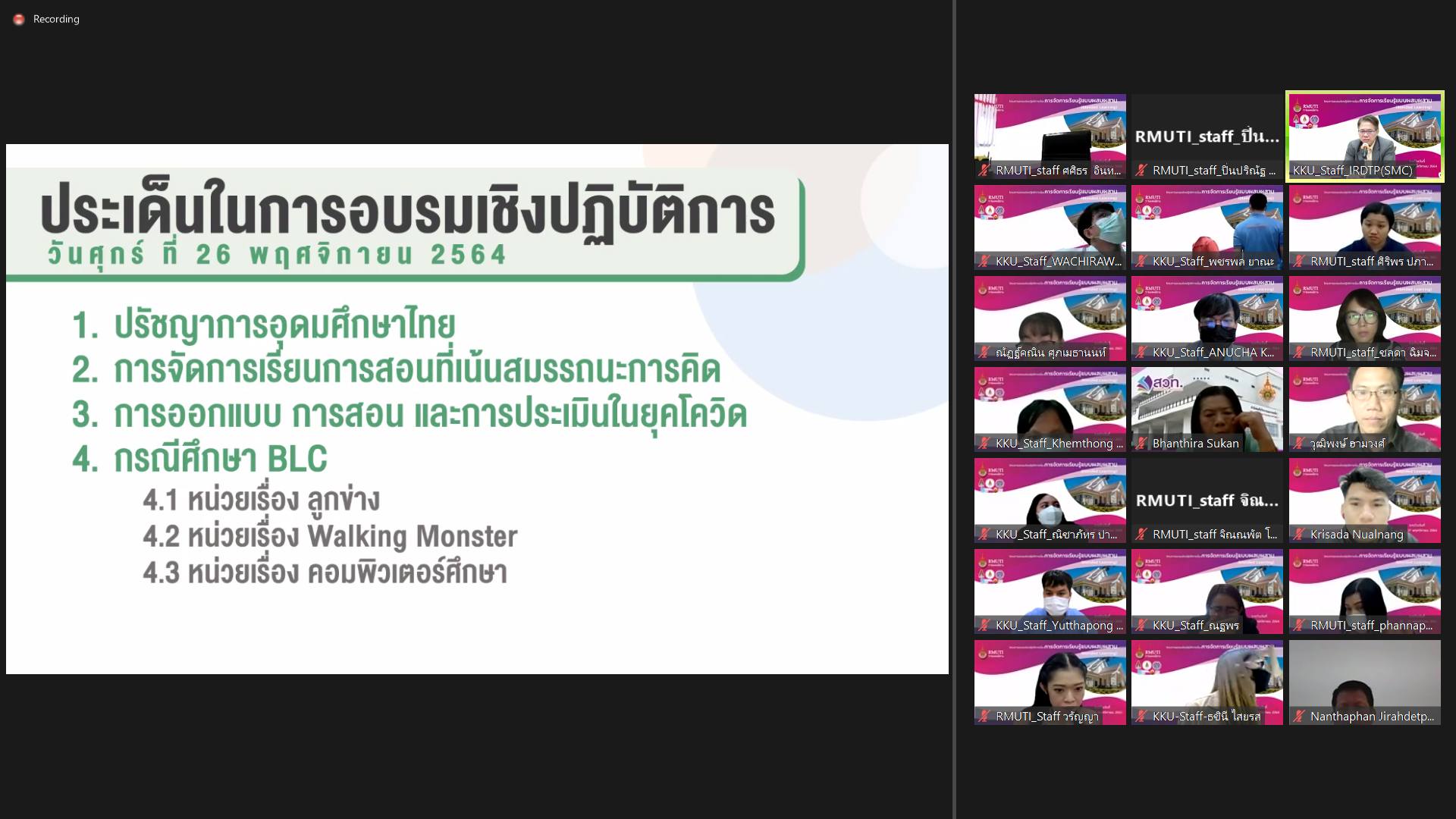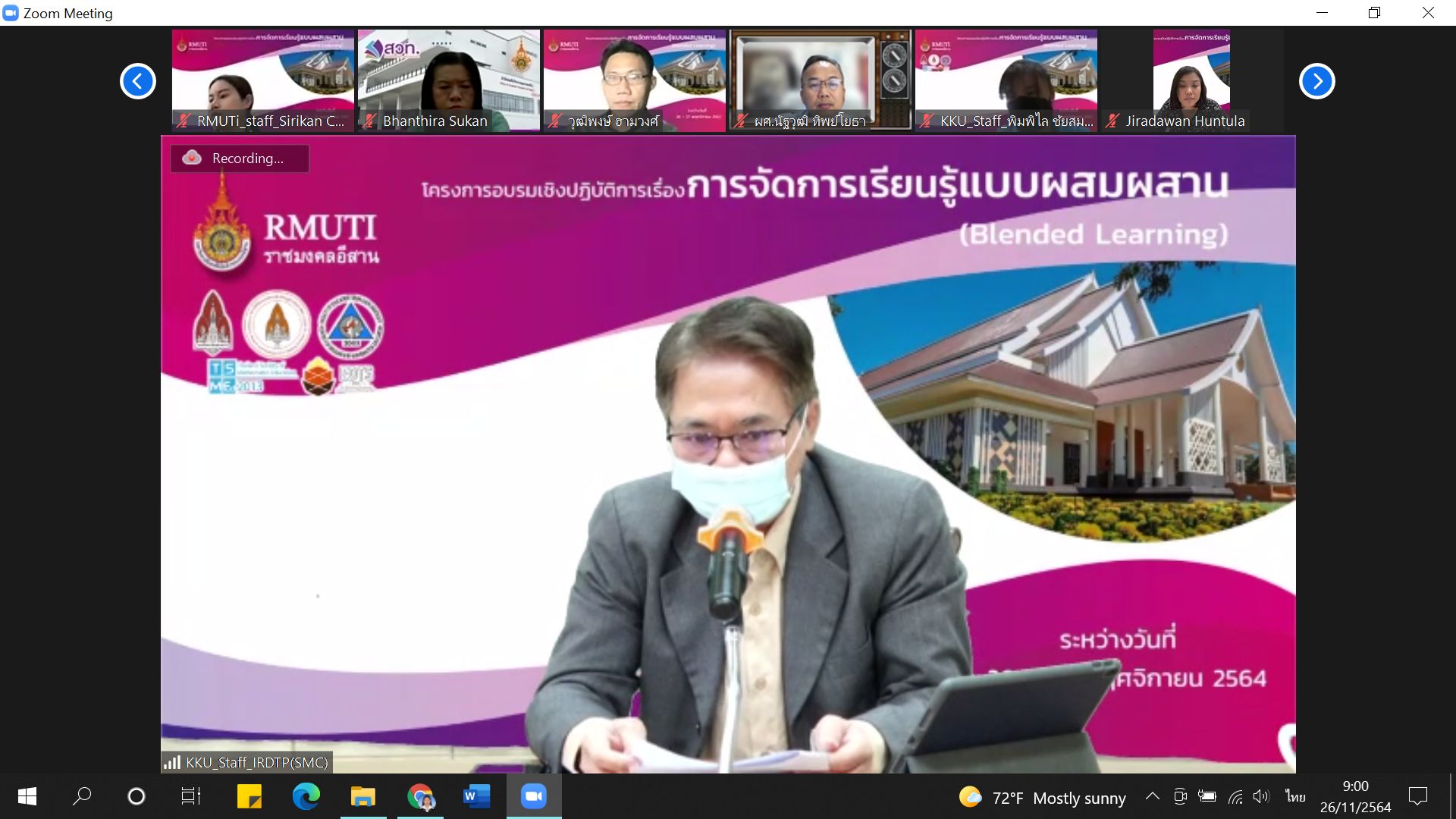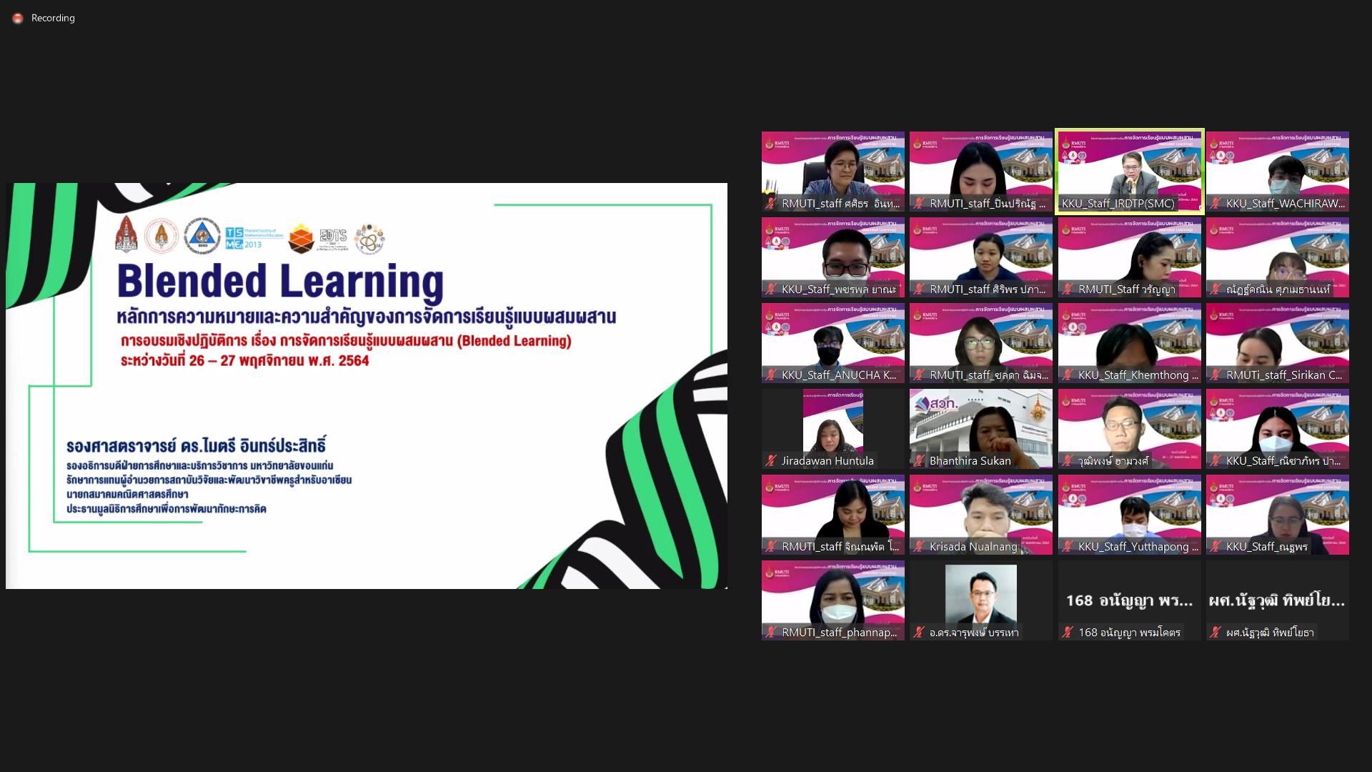 มหาวิทยาลัยเทคโนโลยีราชมงคลอีสาน วิทยาเขตขอนแก่น ให้เกียรติเชิญ รองศาสตราจารย์ ดร. ไมตรี อินทร์ประสิทธิ์ รองอธิการบดีฝ่ายการศึกษาและบริการวิชาการ มหาวิทยาลัยขอนแก่น และรักษาการผู้อำนวยการสถาบันวิจัยและพัฒนาวิขาชีพครูสำหรับอาเซียน และทีมวิทยากรจากสถาบันวิจัยและพัฒนาวิขาชีพครูสำหรับอาเซียน เป็นวิทยากรในการอบรมเชิงปฏิบัติการในหัวข้อ การจัดการเรียนรู้แบบผสมผสาน (Blended Learning) ในวันที่ 26 – 27 พฤศจิกายน 2564 ที่ผ่านมา ผ่านระบบออนไลน์ โดยกิจกรรมดังกล่าว ได้รับเกียรติจาก รองศาสตราจารย์ ดร.โฆษิต ศรีภูธร อธิการบดีมหาวิทยาลัยเทคโนโลยีราชมงคลอีสาน เป็นประธานในการกล่าวเปิดกิจกรรม และกล่าวรายงานโดย รองศาสตราจารย์ ดร.ณรงค์ศักดิ์ ธรรมโชติ รองอธิการบดีฝ่ายวิชาการและวิเทศสัมพันธ์ มหาวิทยาลัยเทคโนโลยีราชมงคลอีสาน ซึ่งมีบุคลากรคณะต่างๆ ของมหาวิทยาลัยเทคโนโลยีราชมงคลอีสานเข้าร่วมการอบรมเชิงปฏิบัติการกว่า 100 คน